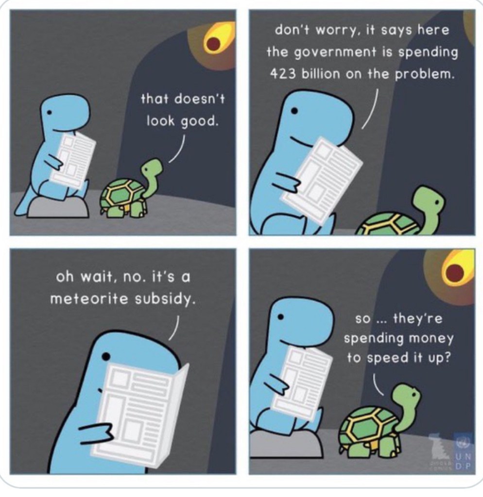 The same governments that are failing to stop fueling Putin’s war by still relying on his gas and oil are the ones that failed to come up with real solutions to climate change at the COP26, who spend money on subsidising fossil fuels, which does nothing to stop climate change. A point well illustrated by this comic referencing the movie Don’t look up.