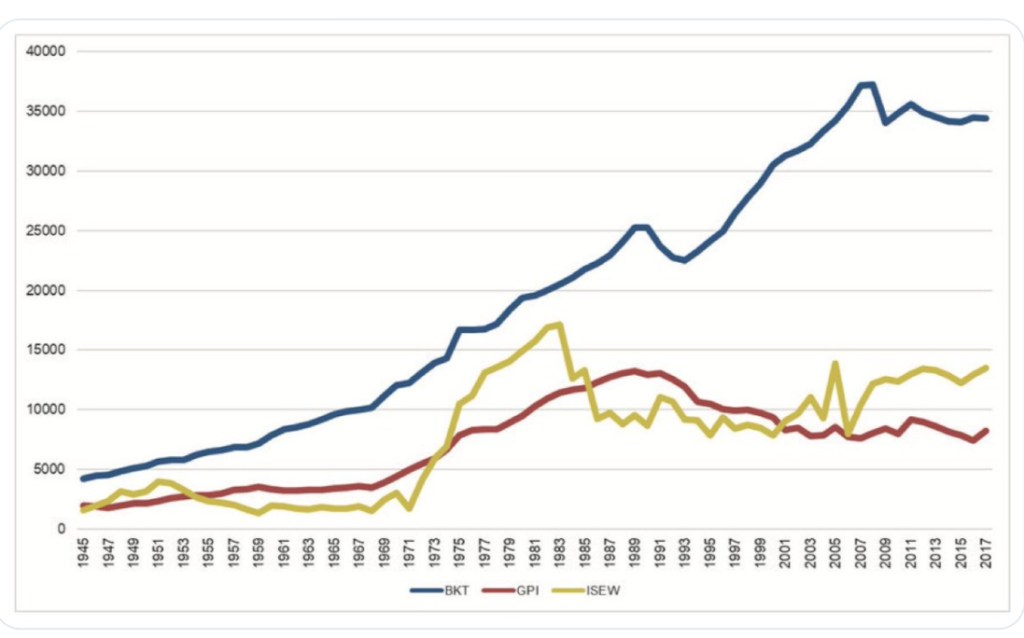 The connection between economic growth and increased well-being is feeble at best. In Finland a calculation of the genuine progress indicator (GPI) showed that since the recession of the 1990s, after more neoliberal economics were introduced GDP growth hasn’t led to equally increased well-being. The following image shows how GDP growth in Finland has not been simultaneous with increased wellbeing, measured by GPI, specially since neoliberal economics in the 1990s. Why then do we keep insisting on GDP and economic growth?